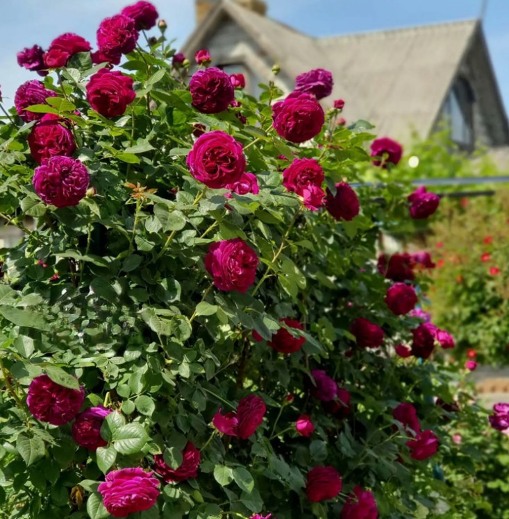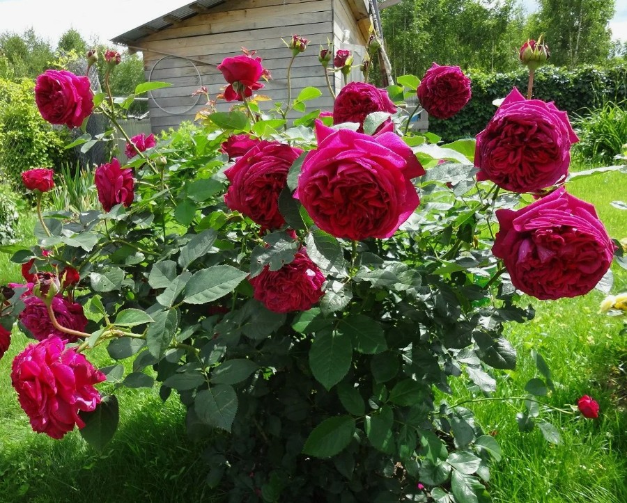 Одна из лучших пурпурных роз остинок. Цвет Falstaff – великолепный темно-малиновый, вначале яркий и насыщенный, позднее выгорающий до блеклого пурпурного. Цветки чашевидные, лепестки короткие и закрученные, обычно образуют рыхлую розетку, но иногда могут быть квартированные или с пуговкой в центре. Появляются по одному или в плотных кистях до 5 шт, на довольно длинных побегах, иногда цветоножки оказываются слабыми и тогда цветки поникают вниз. Хорошо отзывается на обрезание отцветших цветков. Сильно пахнет розовым маслом. Зимостойкая.