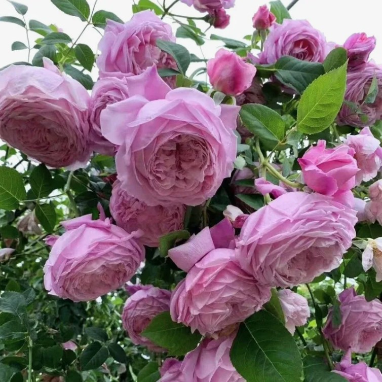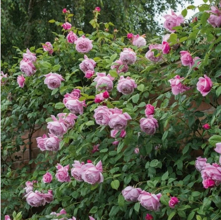 Описание цветка: Цвет – нежно-розовый с сиреневатым отливом. Средний диаметр – 12-14 см. Присутствует мягкий аромат. Цветы густомахровые (до 200 лепестков), чашевидные. Побеги склоняются под тяжестью шаровидных цветов, требуется легкая опора.