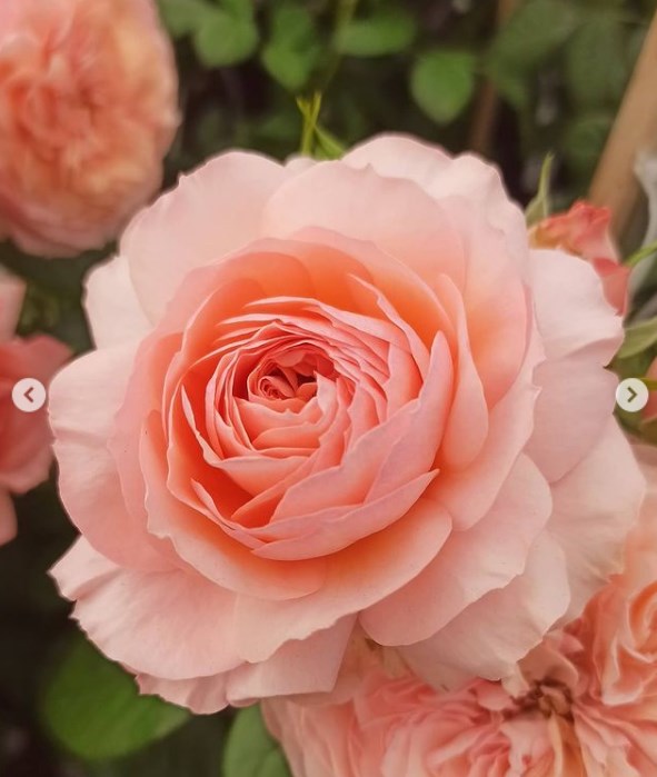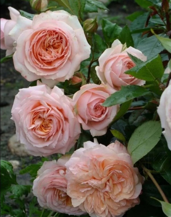 Цветки диаметром 9-12 см, махровые (более 41 лепестка), лососёво-оранжевые с розовыми оттенками. Аромат лёгкий. Цветение обильное, повторное. Листва блестящая, устойчивая к заболеваниям. Куст высотой 80-100 см. Рекомендуется для миксбордеров.
