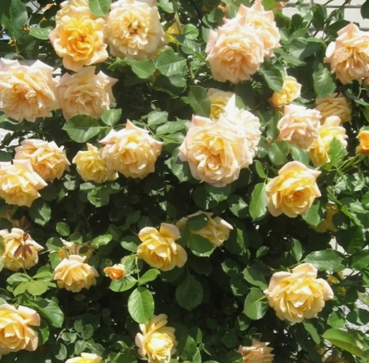 Крупные полумахровые и махровые цветы чудесного насыщенно-желтого цвета, с редкими розовыми потеками. По жилкам – более яркий абрикосовый цвет. Они выгорают до кремовых, начиная с кончиков, и так как лепестки имеют красивую волнистую форму, игра цветов получается необыкновенно красивой. Аромат мягкий, с нотами цитруса. Цветки появляются в кистях по 3-7 шт, цветение очень обильное. Листва крупная, шипы также очень крупные и мощные. Куст сильнорослый, устойчив к заболеваниям.