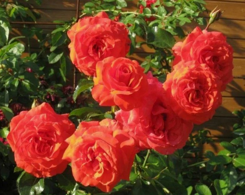 Эффектная кораллово-красная плетистая роза