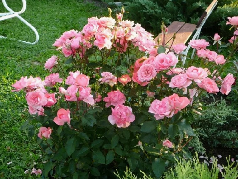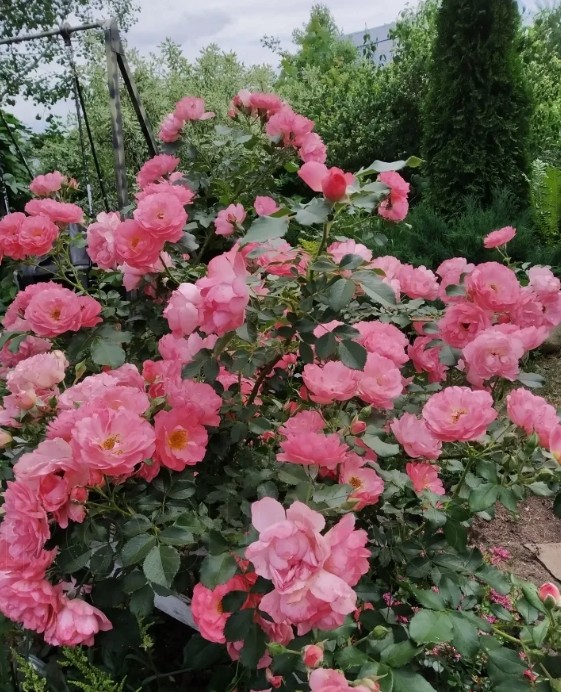 Эта красивая ветвистая флорибунда завоевала множество наград в Европе за эффектность в саду. Цветки густомахровые, с множеством коротких волнистых лепестков, прекрасно переносят дождь и ветер. Они ярко-розовые с лососевым оттенком, и более серебристо-розовыми изнанками лепестков. Окраска неоднородная - на цветке есть пятна более темной окраски, а кое-где почти белые, что создает необычный эффект. Цветки появляются в плотных кистях, обычно по 3-8 шт, иногда больше. Цветение невероятно обильное и почти непрерывное до поздней осени. Устойчивость к дождям, даже осенним. Куст Jardins de France широкий, ветвистый, с очень красивой и устойчивой к болезням, темной блестящей листвой. Обычно розу обрезают и выращивают кустом около 1 м высотой, без обрезки может вырасти вдвое выше. (ARE)