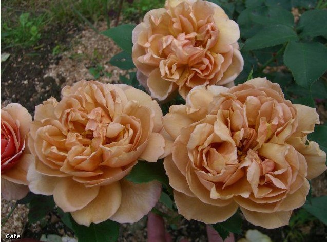 Одна из ранних коричневых роз, Cafe была выведена Кордесом в 1956 г. Цветки немного квартированные, напоминают центифолии, что редкость среди коричневых роз и смотрится очень привлекательно. Цвет Cafe очень сильно зависит от погоды и сезона, но в наилучших условиях сорт цветет крупными цветками цвета настоящего кофе с молоком, однако, всегда с теплым золотистым оттенком. В зависимости от климата и времени года, цветки иногда могут быть слишком резкого медно-желтого цвета, как у золотарника. Также Cafe одна из немногих ароматных коричневых роз – аромат розового масла очень подходит к форме цветков. Еще одна необычность для флорибунды – Cafe вырастает в крупный куст с крупными цветками (9-10 см) в кистях. (Rdrop)