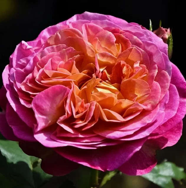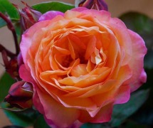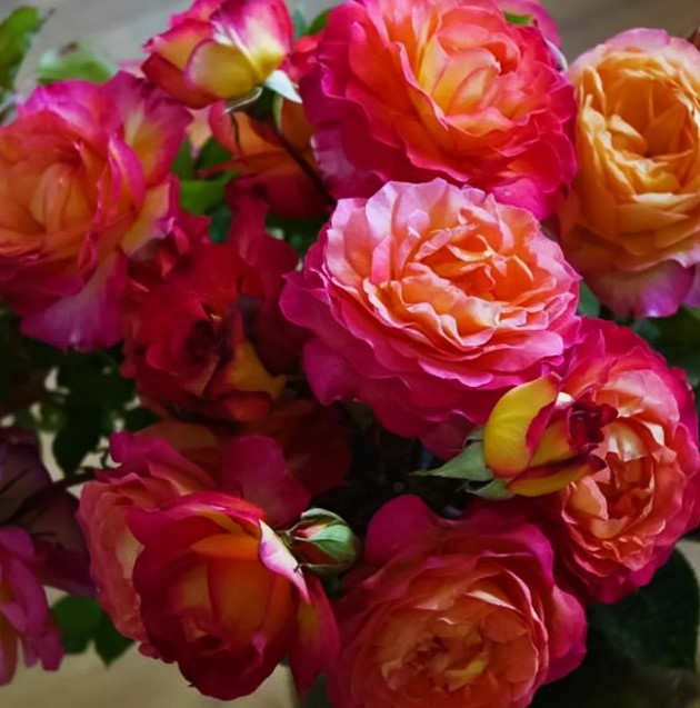 Сорт из серии Les Provencelles ® Collection. Бутоны заострённые. Цветки махровые (60-70 лепестков), чашевидные, округлые, смешанных тонов – оранжевые с розовыми кончиками, жёлтыми и карминово-розовыми оттенками. Аромат лёгкий. Цветение повторное.