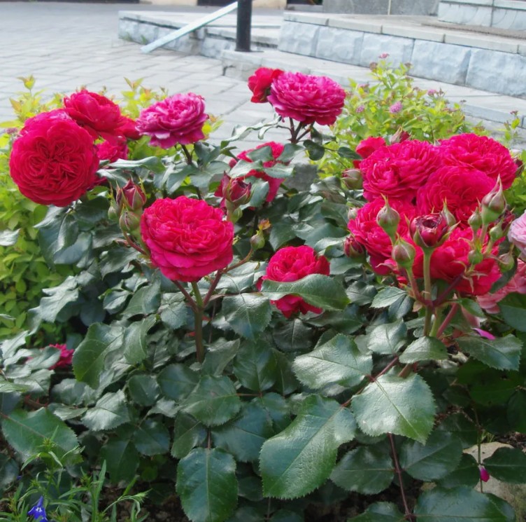 Флорибунда с привлекательными темно-красными цветками, напоминающими розетки. Сорт очень выносливый, обильно цветет, цветки очень устойчивы к дождю. (BKN)